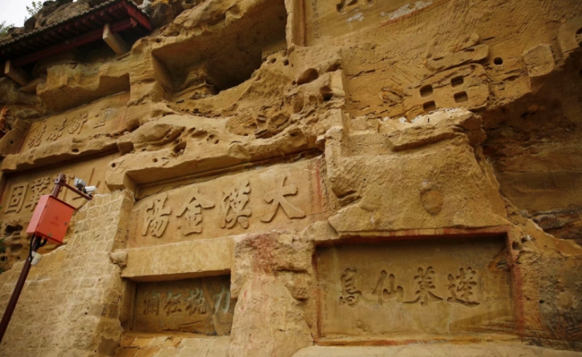 沿着小路慢慢往前走,走到峡谷深处,摩崖石刻群就完完整整地展现在眼前,在初冬的暖阳下愈发清晰可辨。东西两面的崖壁上,密密麻麻的字迹错落有致地分布着,篆、隶、楷、行、草各种字体应有尽有,就像一座露天的书法博物馆,让人目不暇接。左宗棠题写的 “榆溪胜地” 四个大字雄浑大气,笔锋刚劲有力,在清寒的风里更显将军的豪情壮志;抗日将领马占山笔下的 “还我河山”,笔锋凌厉果断,每一笔都藏着穿透初冬寒意的爱国赤诚,让人看了不由得心生敬佩。还有那些不知名文人墨客的题咏,有的感叹山河壮景,赞美红石峡的奇绝风光;有的抒发初冬感怀,借着山水抒发内心的思绪。每一笔都凝聚着书写者的心境,每一个字都记录着时代的痕迹。这些石刻,是文字与岩石的对话,是历史与当下的呼应,让红石峡不只是一处初冬胜景,