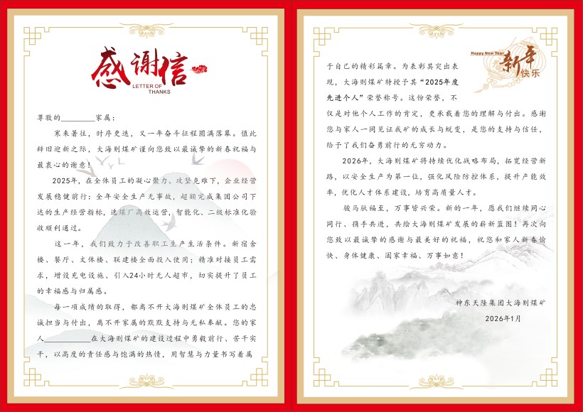 这封感谢信及小小纪念品,谨代表大海则煤矿向职工及家属表达最真挚的心意。再次衷心感谢员工们的卓越贡献与辛勤付出!衷心感谢各位家属的深切理解与全力支持!